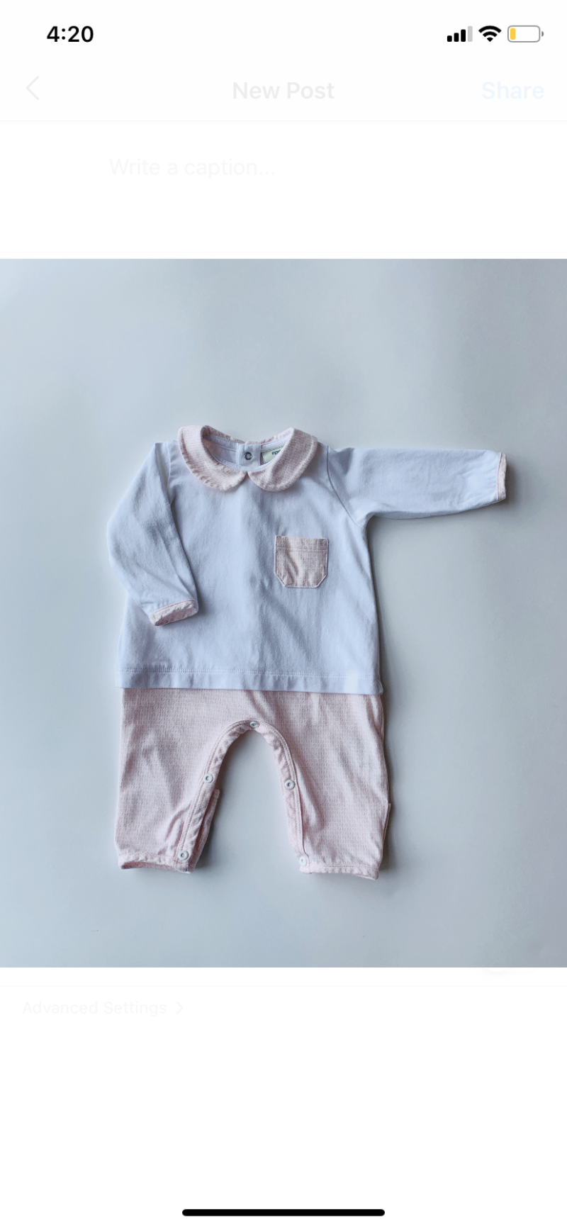 Cute collared bodysuit. Size 3m on tag. Very faint discoloured spot on pocket but hardly noticeable.  Built in feet that fold around from Back.